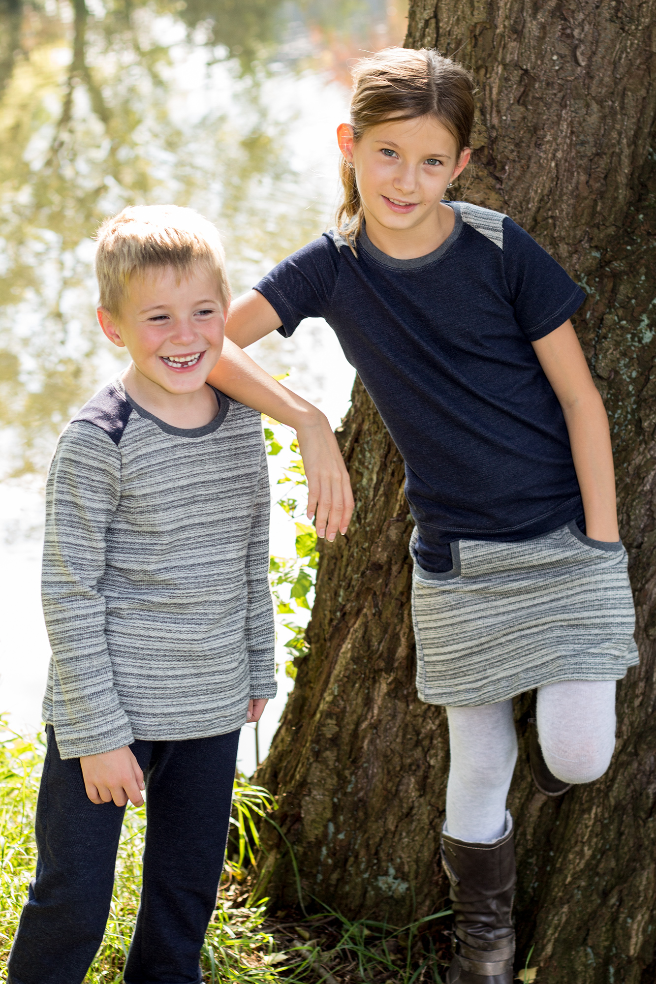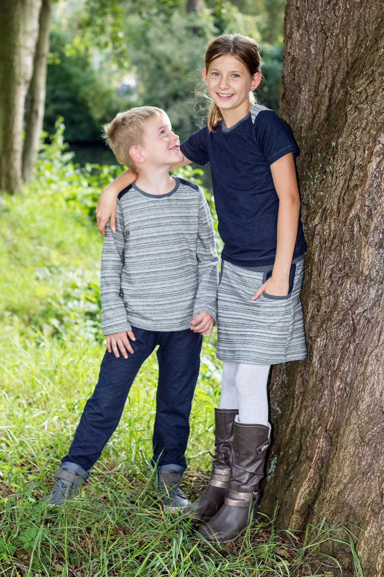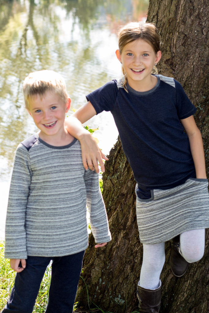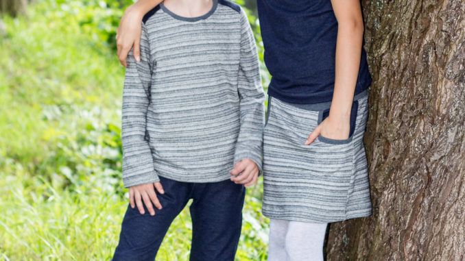 Alle haben ein Shirt „Pepe“ von mialuna bekommen. Bei dem großen Blühwürmchen habe ich es etwas tailliert zugeschnitten. Der Rock vom großen Blühwürmchen ist nach dem Freebook „Little Sweat Skirt“ von Lin-Kim.